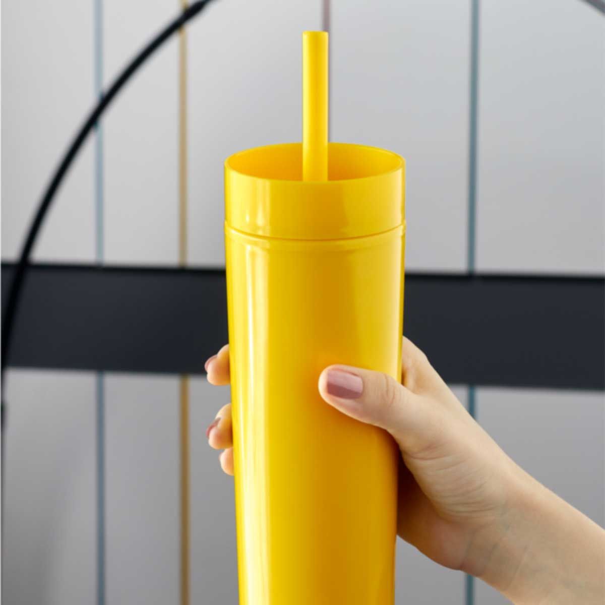 Doble pared. Pared interna y externa de plástico. Tapa de plástico con cierre a presión. Incluye popote y caja individual.