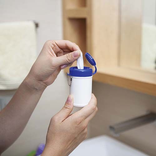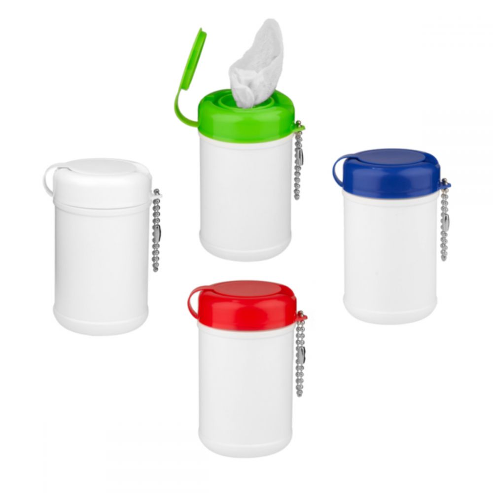 Contiene 30 toallitas húmedas. Incluye cadena metálica.