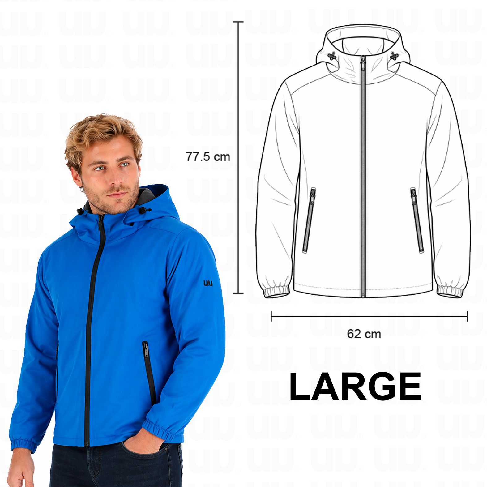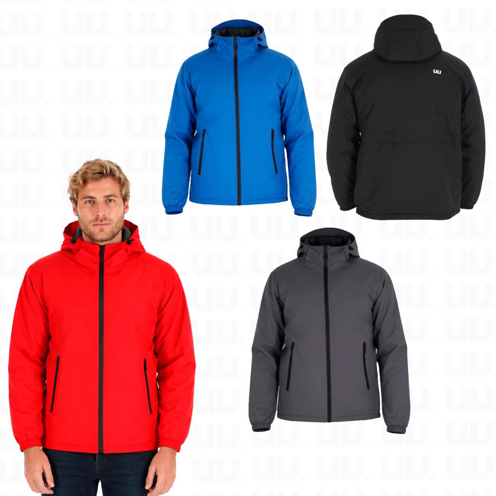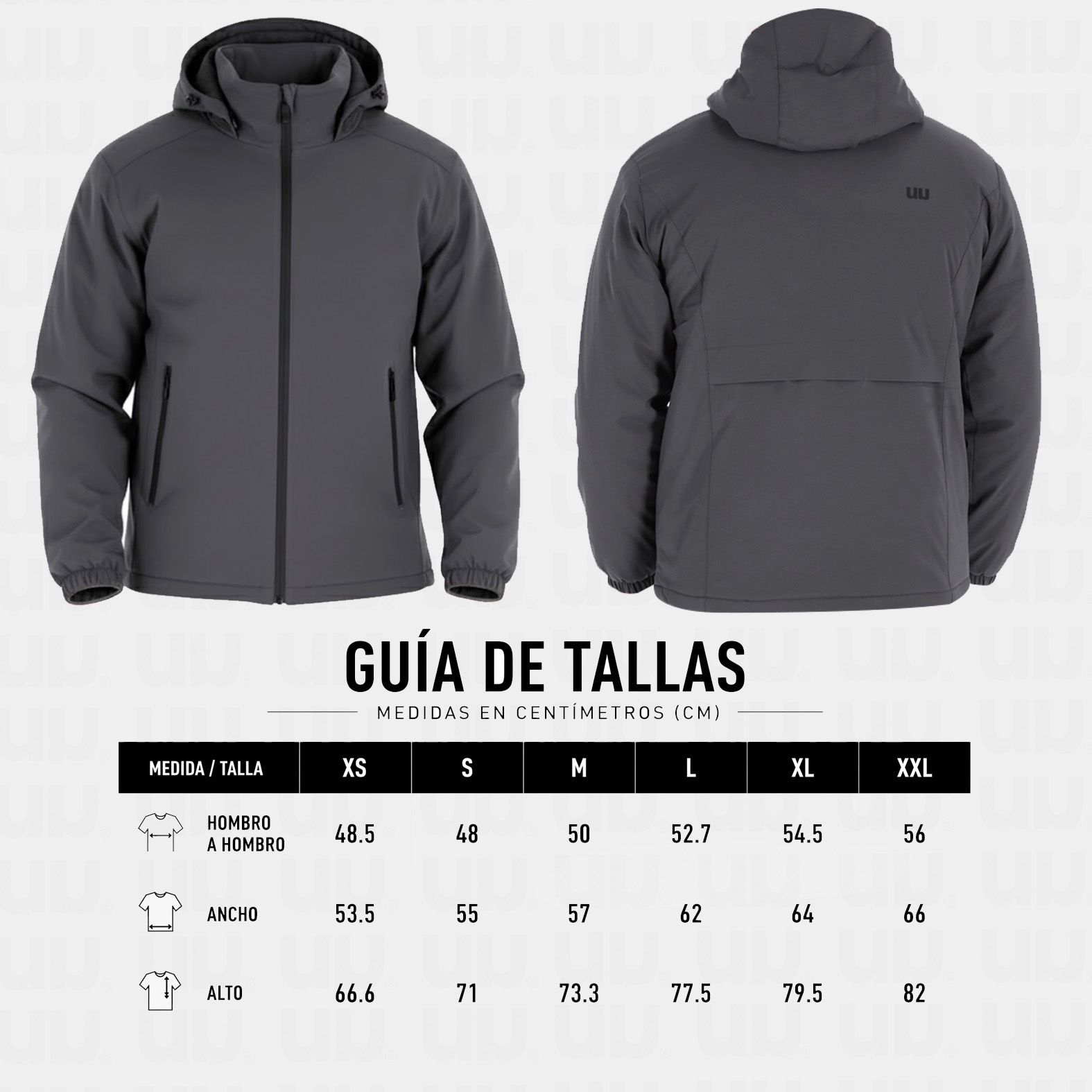Chamarra con forro interno, capucha ajustable, cierre frontal y bolsillos laterales. Resistente al viento y a la lluvia.