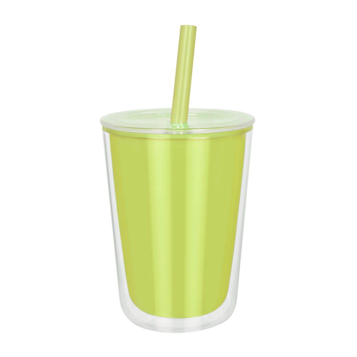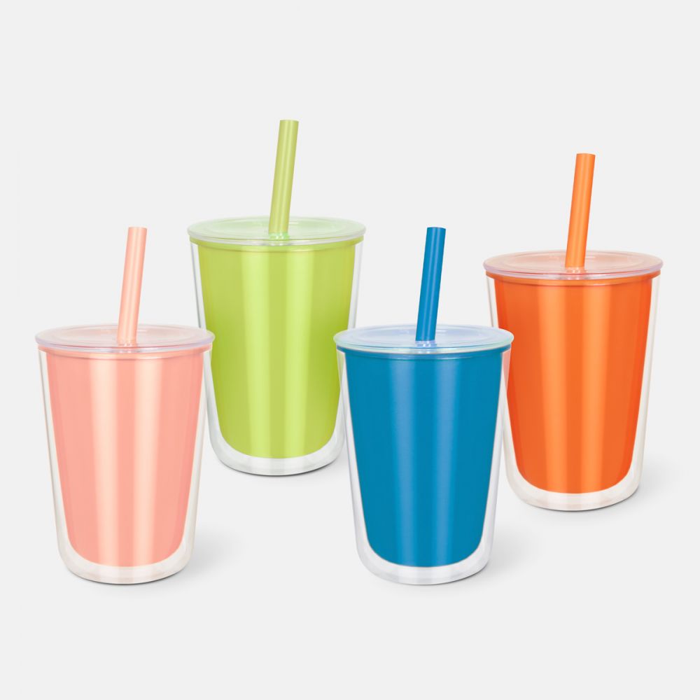 Vaso de plástico doble pared. Su peculiar diseño, cuenta con una pared interna de color y una pared externa transparente, que le da un aspecto moderno y vibrante. La tapa con cierre push y el popote a juego, añaden originalidad a este vaso. Ideal para llevar tus bebidas favoritas a donde vayas. Capacidad de 23 Oz. Base de 9 cm de diámetro. Incluye caja individual.
