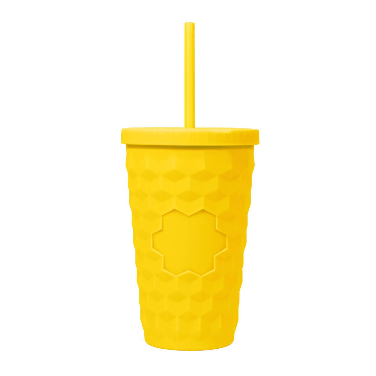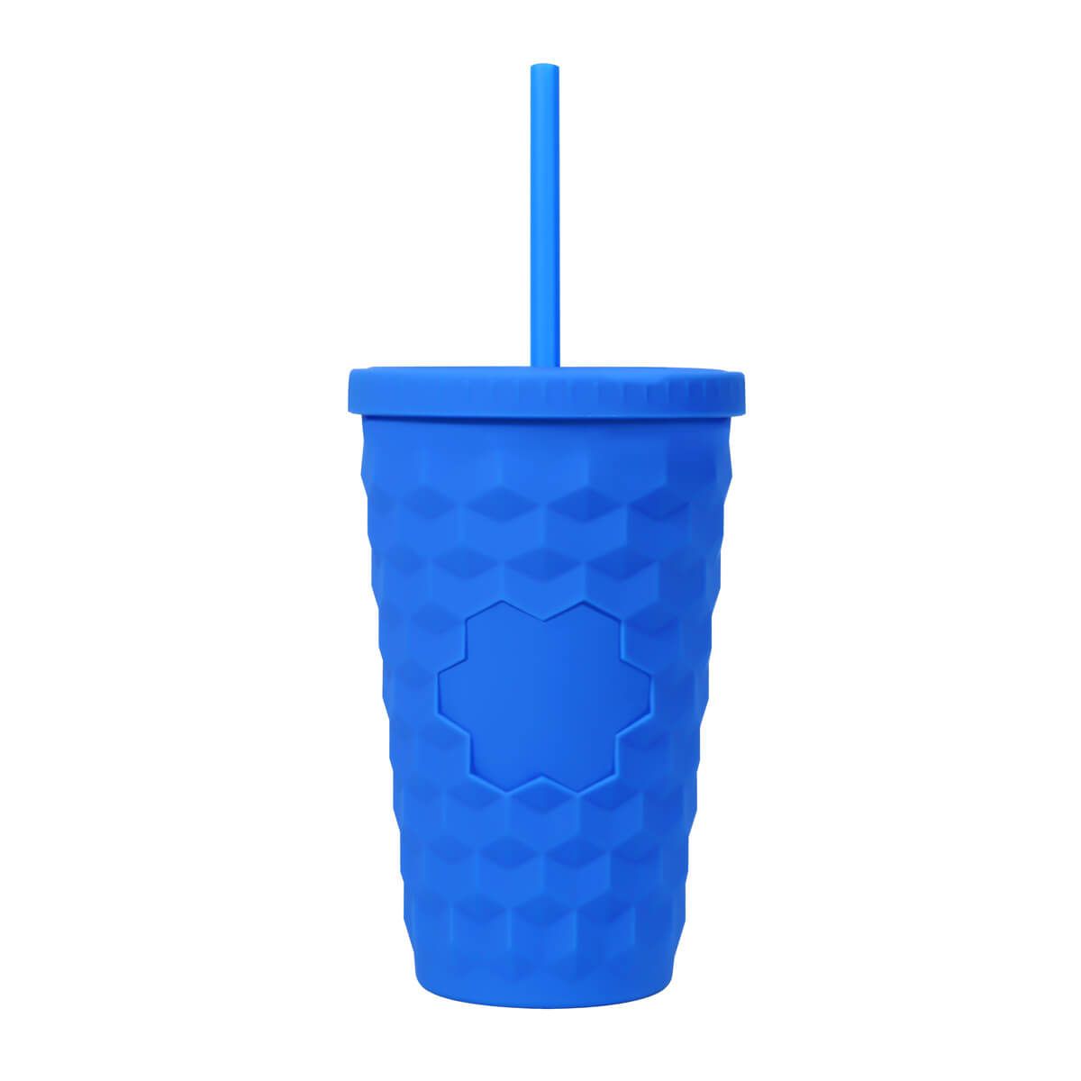 Vaso doble pared. Pared interna y externa de plástico. Tapa de plástico con sistema de rosca. Incluye popote. Cuerpo con terminado rubber que lo hace suave al tacto. Su diseño en relieve le da un toque único y diferente, además permite un mejor agarre al llevar tus bebidas favoritas. Capacidad 16 Oz. Base de 6.7 cm de diámetro. Caja individual incluida.