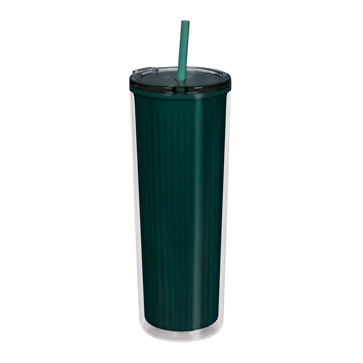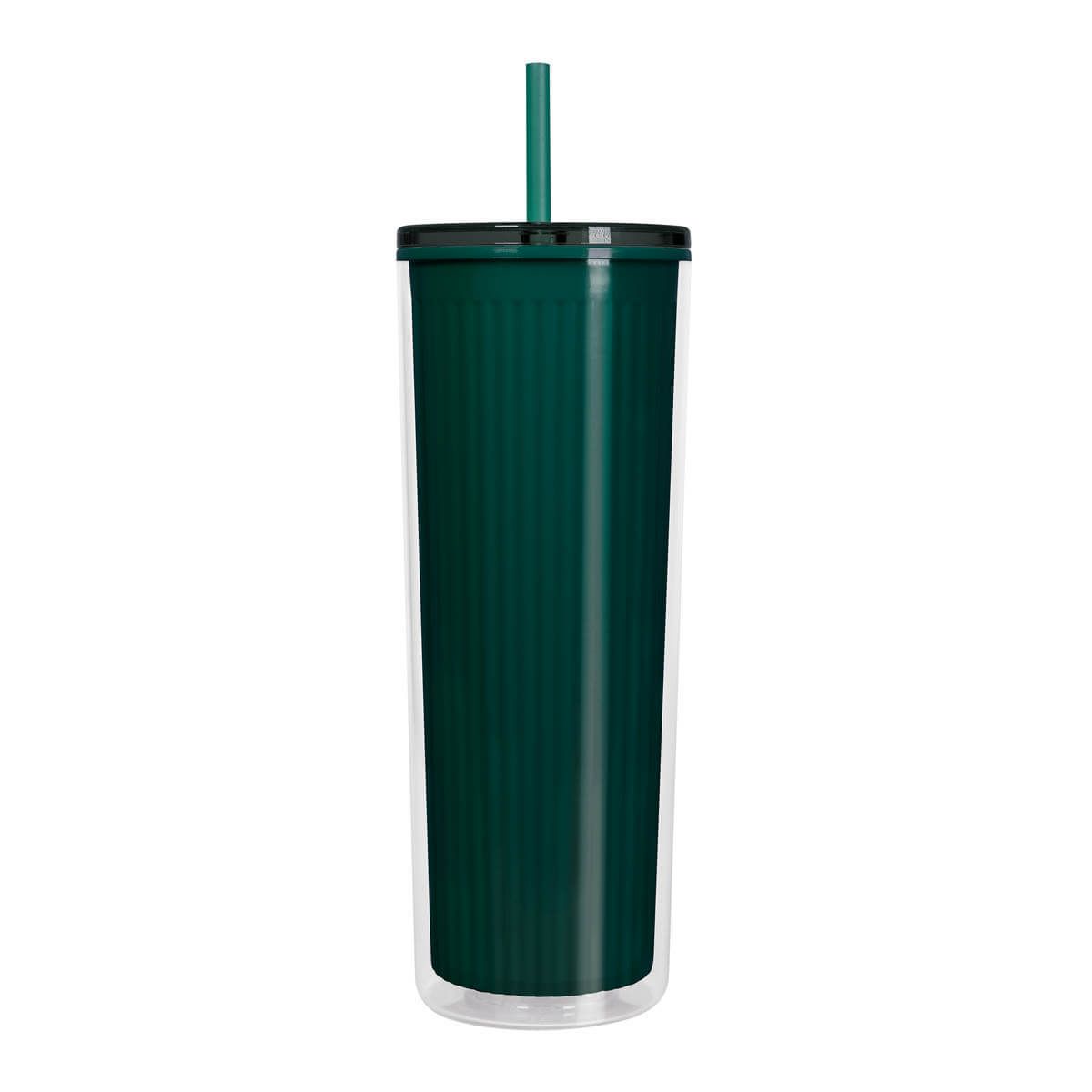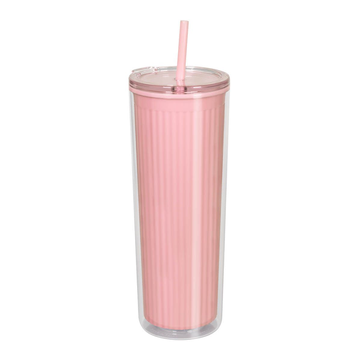 Termo de plástico doble pared. Pared interna de color, texturizada a rayas, y pared externa lisa y transparente que, en conjunto, ofrecen un diseño moderno y vibrante. Incluye tapa de plástico con sistema push y popote a juego. Capacidad de 22 Oz. Base de 7.5 cm de diámetro. Incluye caja individual.