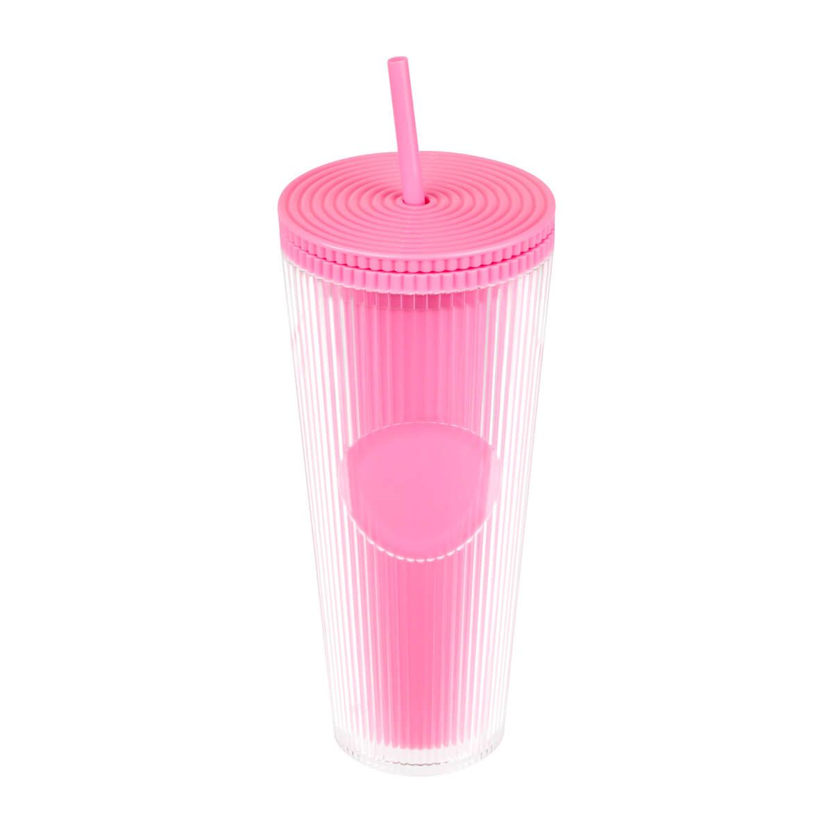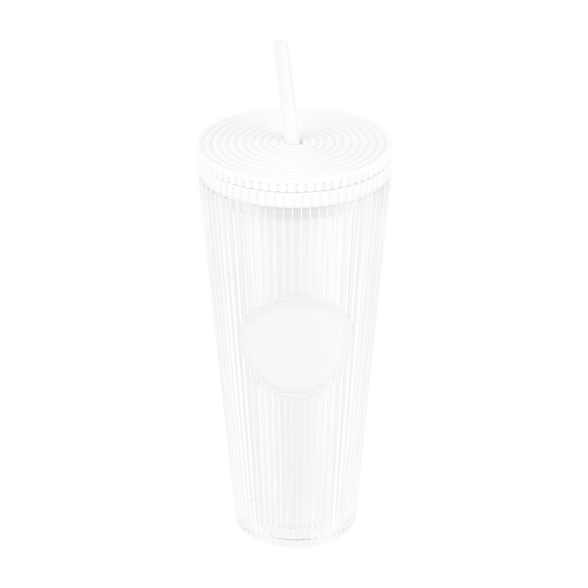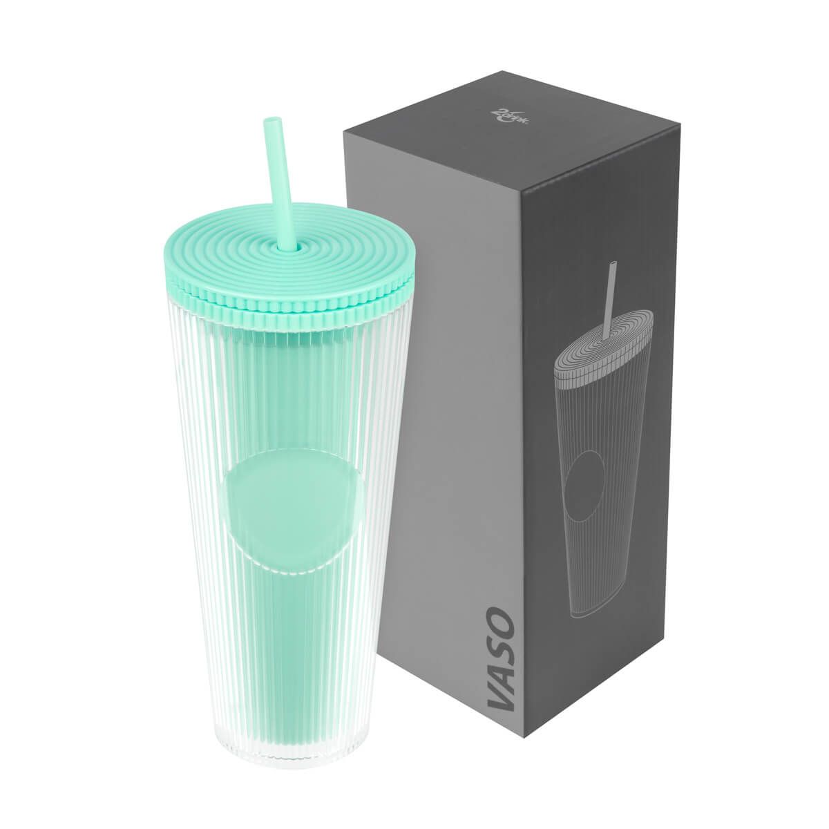 Vaso doble pared. Pared interna y externa de plástico. Tapa de rosca y ranura para popote. Diseñado moderno de acabado texturizado, con líneas en relieve le dan un toque único y moderno. Ideal para oficina, escuela o para disfrutar de tus bebidas mientras viajas. Capacidad de 24 Oz. Base de 7 cm de diámetro. Incluye popote de plástico y caja individual.