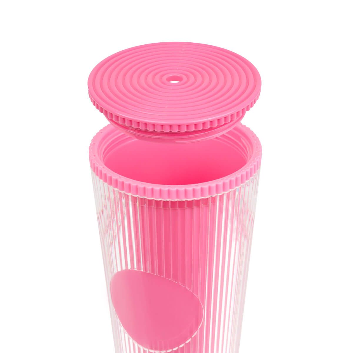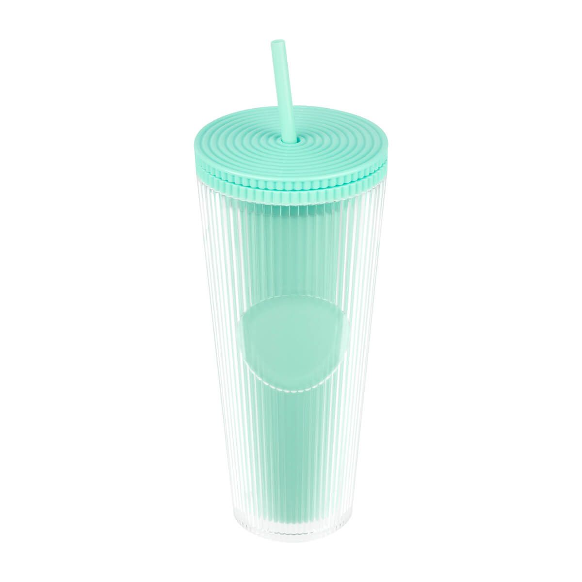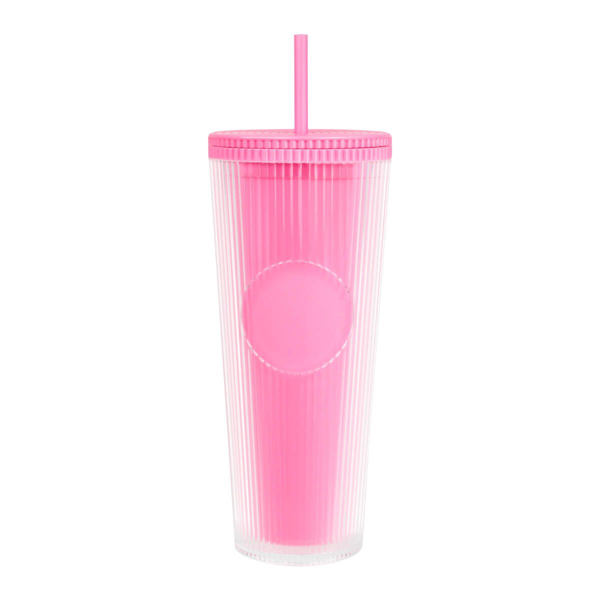 Vaso doble pared. Pared interna y externa de plástico. Tapa de rosca y ranura para popote. Diseñado moderno de acabado texturizado, con líneas en relieve le dan un toque único y moderno. Ideal para oficina, escuela o para disfrutar de tus bebidas mientras viajas. Capacidad de 24 Oz. Base de 7 cm de diámetro. Incluye popote de plástico y caja individual.